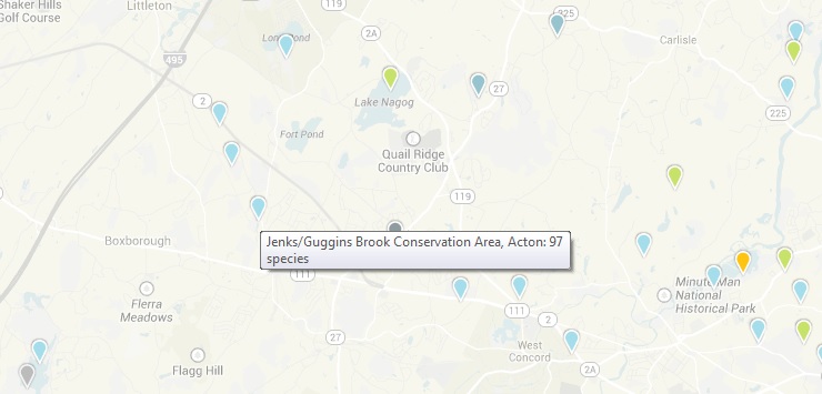 Species counts at various hotspots near Boxborough as of September 12, 2013: